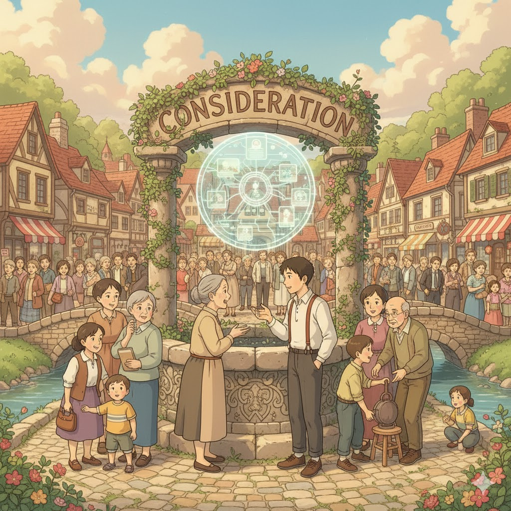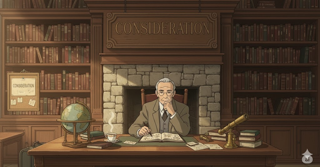 라틴어 considerare ("별들을 함께 관찰하다, 신중하게 생각하다")에서 유래 → con- ("함께") + sidera ("별들")의 합성어 → 중세 프랑스어 consideracion을 거쳐 영어로 유입 → 원래 **'별을 보듯이 신중하게 사물을 관찰하고 생각하는 행위'**를 의미했음 → 이 의미가 현대 영어에서 '어떤 문제나 제안을 신중하게 생각하는 행위' (고려, 숙고) 명사로 발전함. 나아가 '다른 사람의 감정이나 필요를 헤아리는 마음' (배려, 고려 사항), '거래에서 주고받는 가치' (보답, 대가), 그리고 '어떤 것의 중요성' (중요성)의 의미를 가지게 되었어요. 즉, **'신중한 생각, 타인에 대한 배려, 금전적/비금전적 보상, 그리고 가치'**를 나타내는 핵심 단어예요.