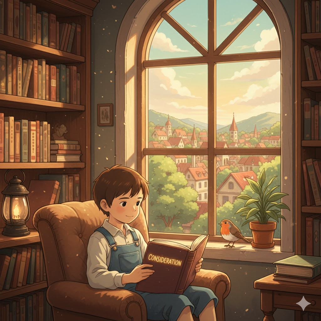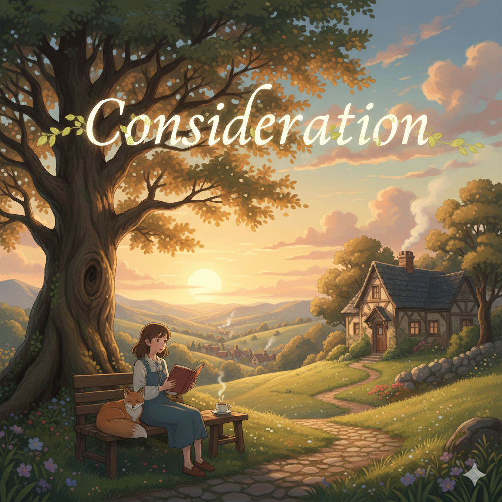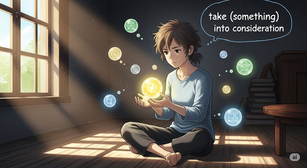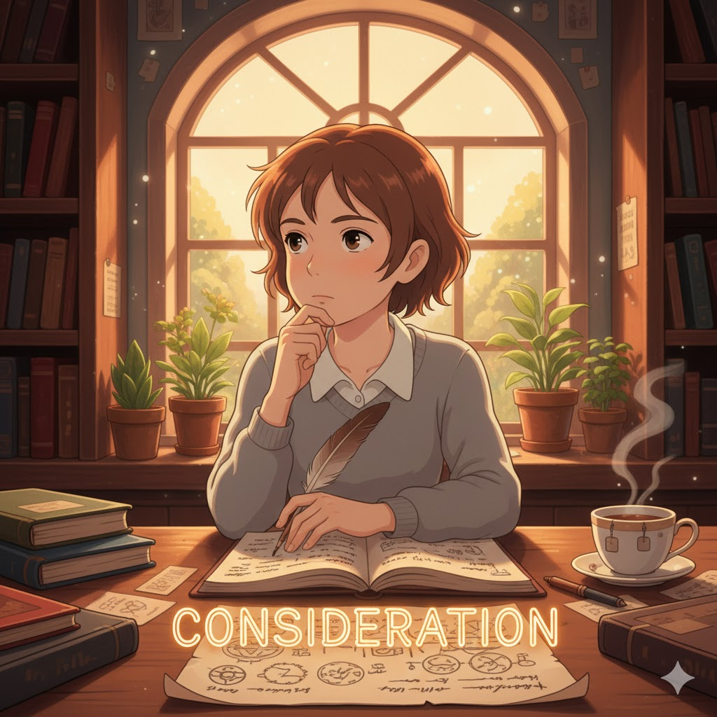 어떤 결정을 내리거나 행동하기 전에 신중하게 생각하고 검토하는 정신적 과정을 의미합니다. 단순히 '생각'하는 것을 넘어, **'타인을 배려하는 마음'**이나 **'중요하게 여겨야 할 요소(고려 사항)'**를 뜻하기도 합니다. 깊이 있는 '숙고'와 '배려'의 개념이 핵심입니다.