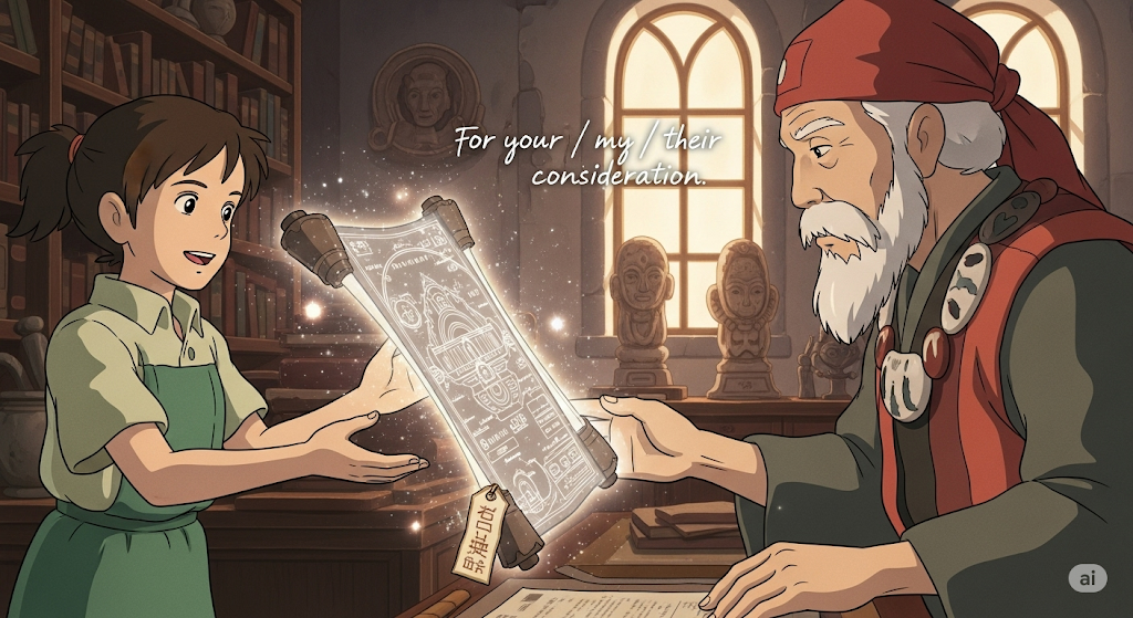 - *'for your/my/their consideration'**은 특히 비즈니스, 학술, 또는 공적인 맥락에서 어떤 문서나 제안을 제출할 때 주로 사용됩니다. 이 표현은 상대방에게 어떤 것을 검토해 달라고 정중하게 요청하는 역할을 하며, '고려'라는 행위의 주체를 명확히 하는 데 유용합니다.