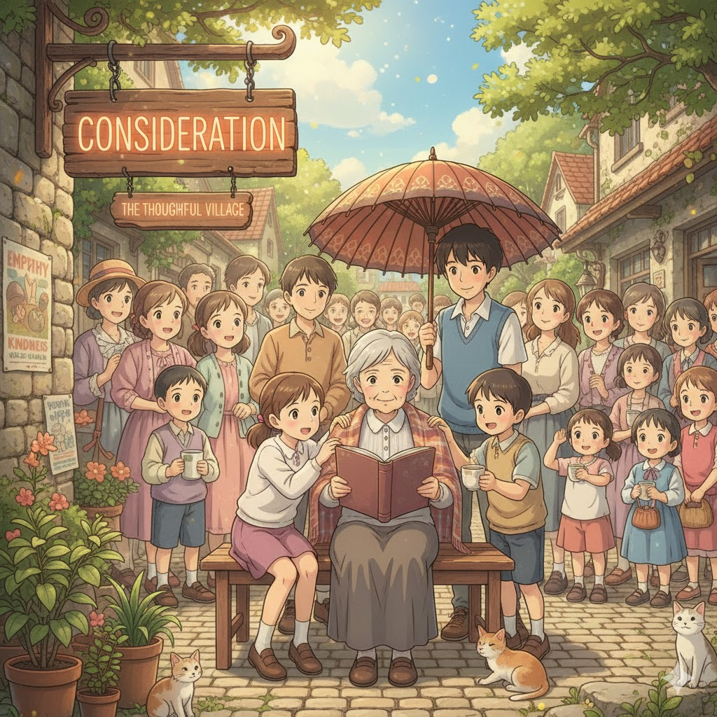 '다른 사람'(someone)의 '감정'(feelings), '상황'(situation), 또는 '필요'(needs)를 '인지'(aware)하고, '그들을 배려'하는 '태도'(manner)나 '친절'(kindness)한 '행동'을 '드러내는' 행위를 의미합니다. 이는 '타인에 대한 **공감'**과 '존중'(respect)에 초점이 맞춰져 있습니다.