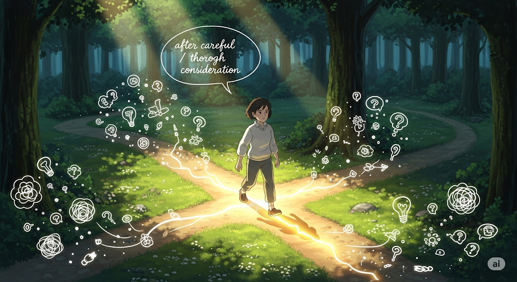 뉘앙스: "신중하고 철저한 고려 끝에"라는 의미입니다. 이는 어떤 결정을 내리기 전에 모든 가능한 측면을 깊이 있고 꼼꼼하게 검토했음을 강조하는 표현입니다. 단순히 생각만 한 것이 아니라, 충분한 시간을 들여 숙고한 결과라는 것을 나타냅니다.