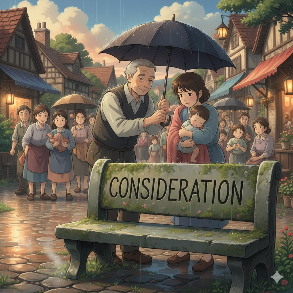 consideration [kənˌsɪdəˈreɪʃn] 상대방을 생각하는 마음, 신중함 강조