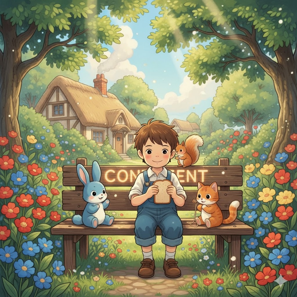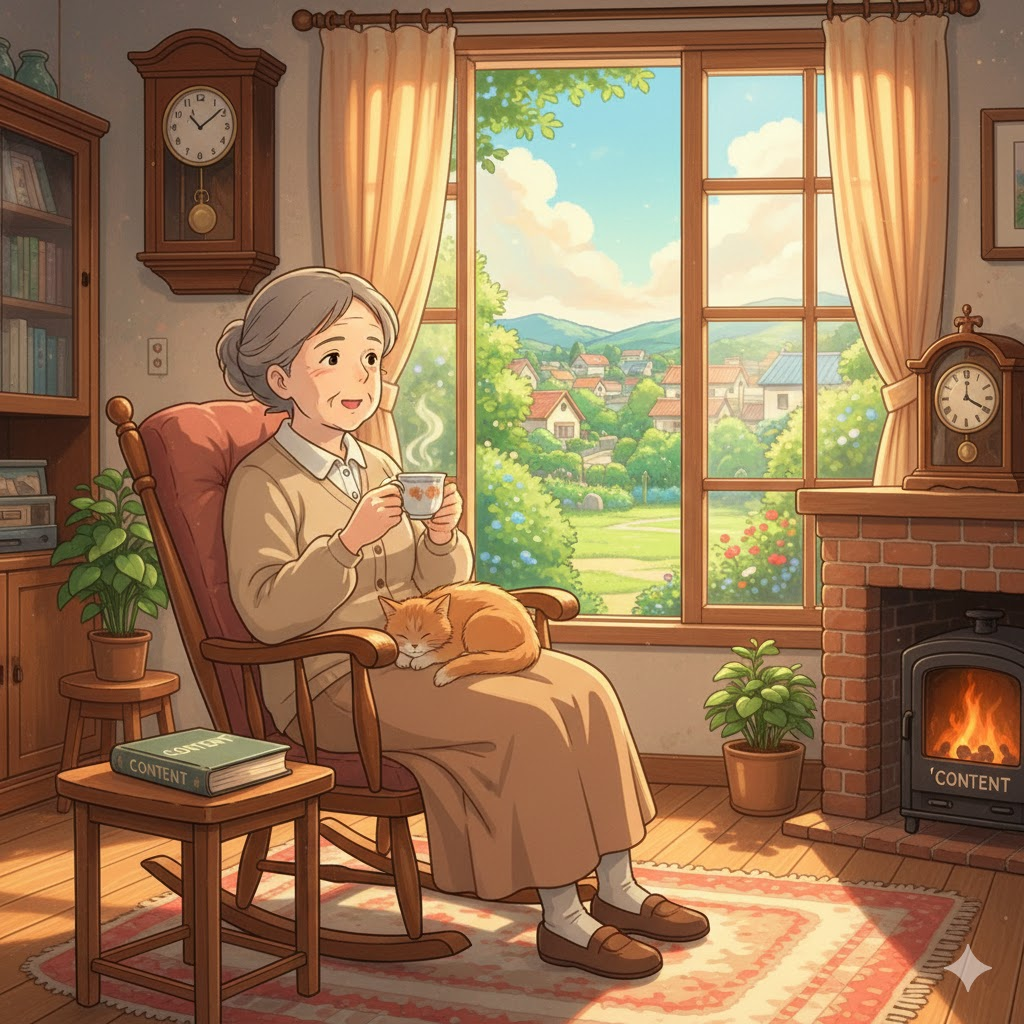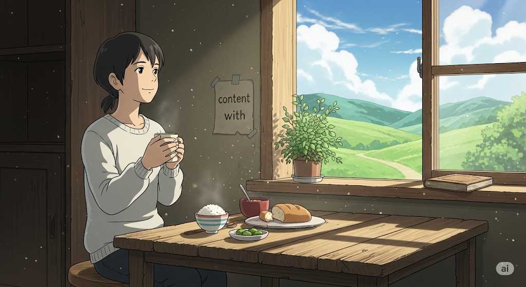'자신'이 '현재' '가지고' 있거나 '처해 있는' 상황(situation)이나 '수준'(level)에 대해 '충분'하다고 느껴 '더 이상'을 '요구'(demand)하거나 '바라지 않는' '평온한 **만족감'**을 느끼는 상태를 의미합니다. 이는 '행복'(happiness)과 '평화'(peace)의 뉘앙스를 가집니다.