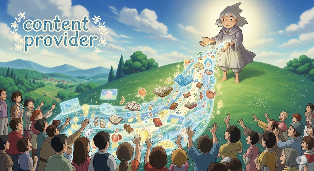 뉘앙스: "콘텐츠 제공자" 또는 "콘텐츠 제공업체"를 의미합니다. 이는 책, 영화, 음악, 정보 등 다양한 형태의 창작물이나 정보를 만들어 사람들에게 제공하는 주체를 뜻합니다. 단순히 물건을 파는 것이 아니라, 창의성과 지식을 공유하는 행위를 나타냅니다.