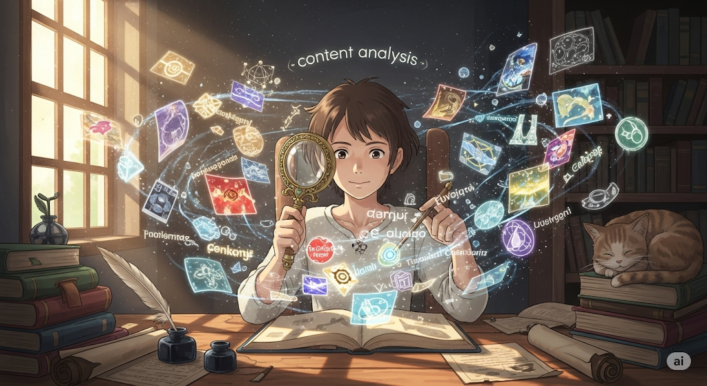 뉘앙스: "내용 분석"을 의미합니다. 단순히 내용을 읽는 것을 넘어, 어떤 자료(글, 그림, 영상 등)의 숨은 의미나 경향을 파악하기 위해 체계적으로 연구하고 분석하는 과정을 나타냅니다. 이는 지적이고 탐구적인 활동이라는 느낌을 강조합니다.