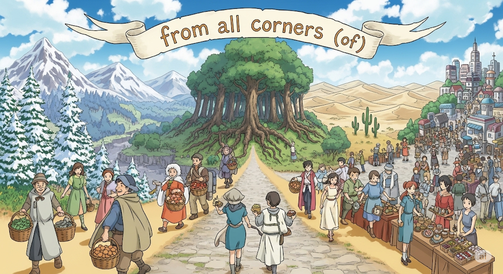 - *'from all corners (of)'**는 사람이나 사물이 매우 넓은 지역에서 모여드는 것을 강조하는 비유적 표현입니다. 이는 특히 다양성, 포괄성, 또는 광범위한 영향력을 묘사할 때 사용됩니다.