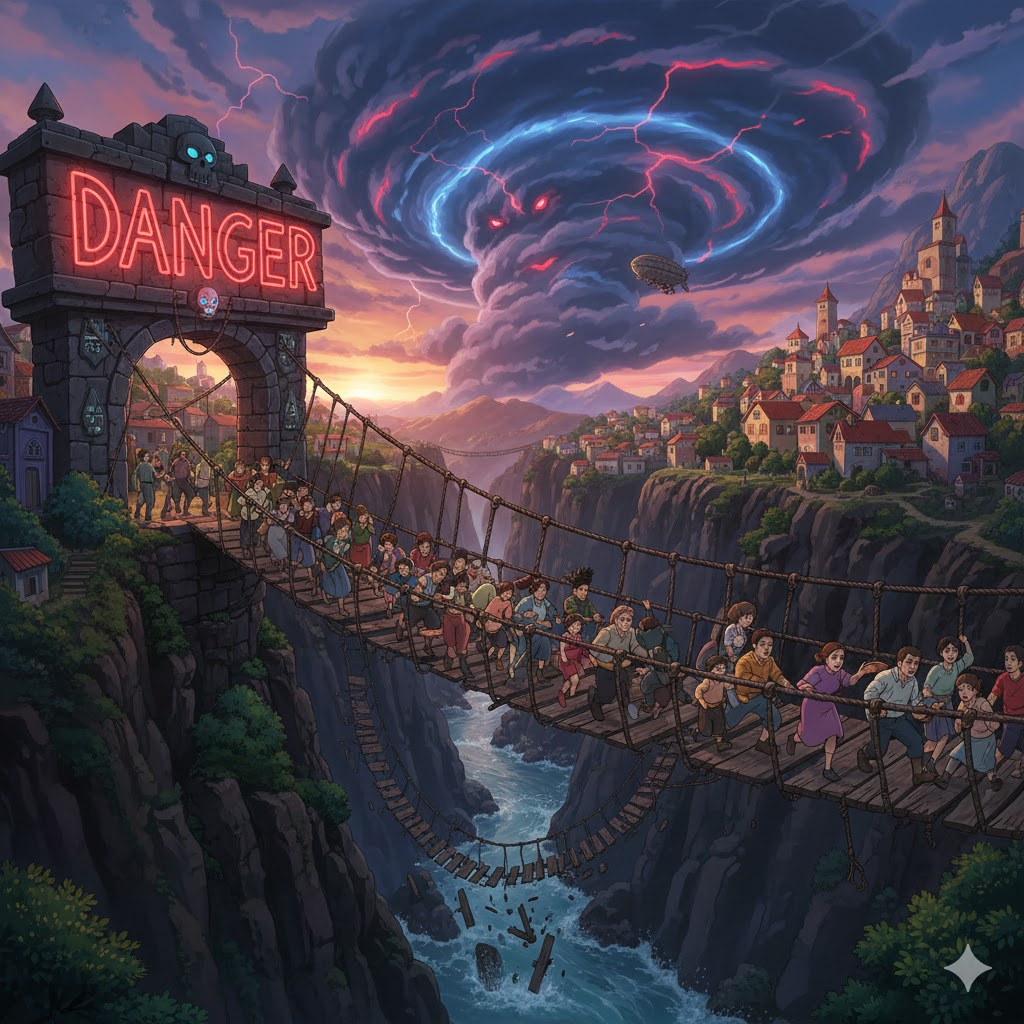 예문: The villagers were in dire peril from the rising floodwaters.