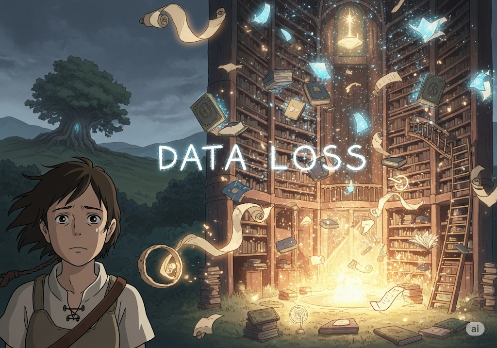뉘앙스: 컴퓨터 시스템이나 저장 장치에서 정보나 자료가 지워지거나 손상되어 더 이상 사용할 수 없게 되는 상황을 의미합니다. 소중한 정보가 사라지는 부정적인 경험에 초점을 맞춥니다.