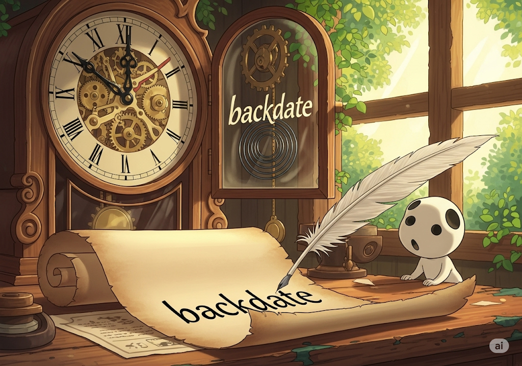 날짜를 소급 적용하다. 문서를 실제 작성일보다 이전 날짜로 기입하거나 소급하여 효력을 발생시키는 것을 의미합니다.