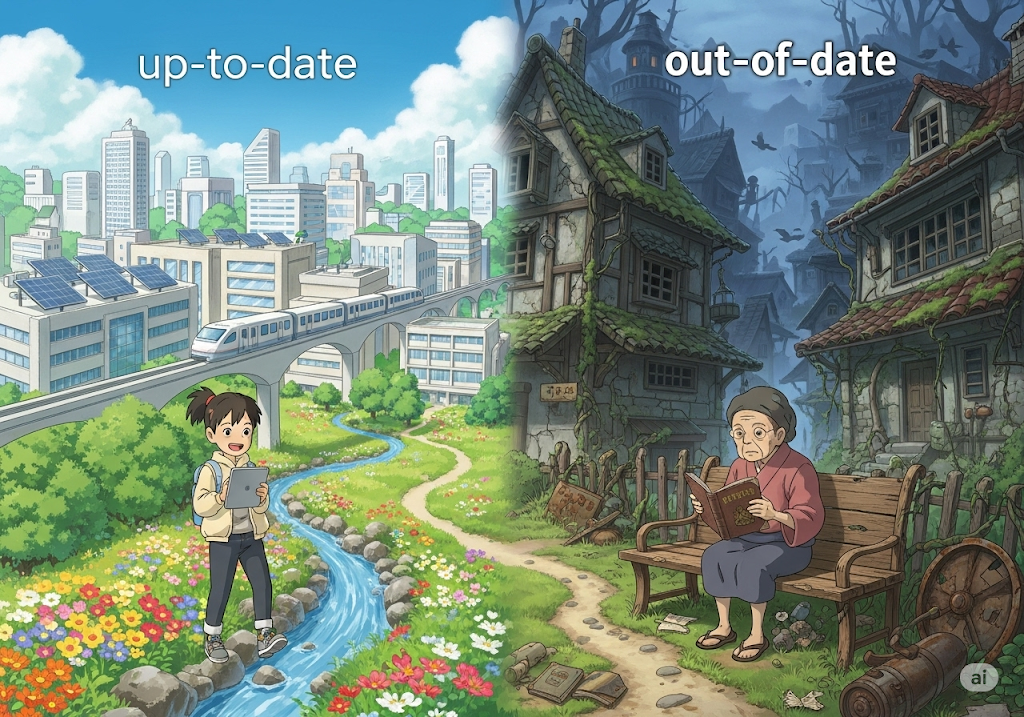 - *'up-to-date'**는 정보나 기술이 현재 시점의 기준에 부합함을 긍정적으로 표현합니다. 반면에 **'out-of-date'**는 그것이 더 이상 유용하지 않거나 관련성이 없음을 부정적으로 표현합니다.