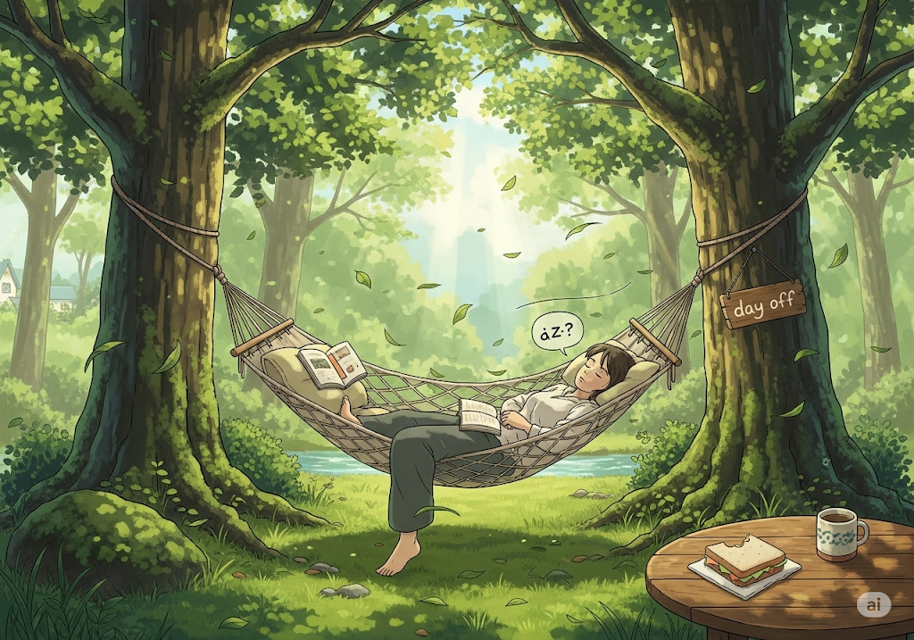 뉘앙스: 일이나 학업의 의무에서 벗어나 휴식하거나 자유롭게 시간을 보내는 날을 의미합니다. 일상적인 책임에서 벗어난 자유와 평온함을 강조하는 표현입니다.