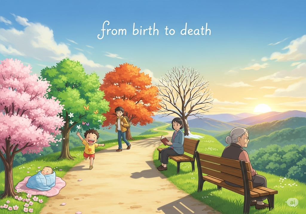 '삶'(life)의 '시작'(birth)부터 '끝'(death)까지, '개인의 전체' '일생'(life's journey) 또는 '총 기간'(length of time)을 의미합니다. 이는 '삶의 완전한 경험'(experience) **'전체'**를 강조합니다.