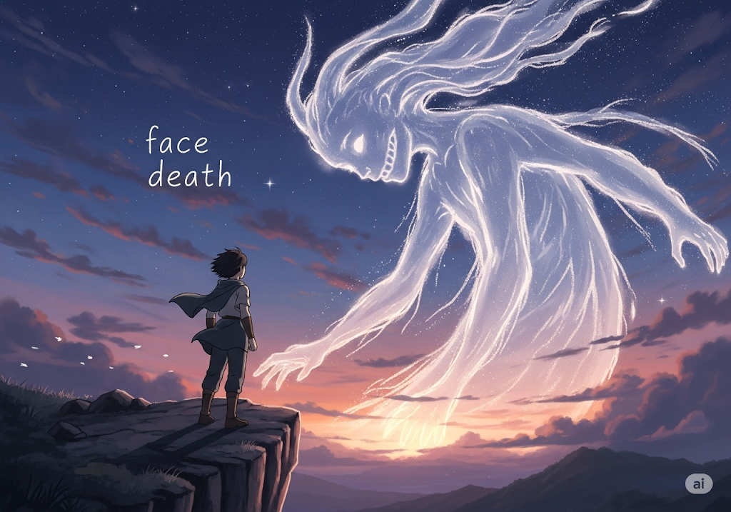 | face | 직면하다, 마주하다 | 동사로, 어떤 '어려운' '상황'을 '정면'으로 '바라보는' 행위. | death라는 '죽음'과 '정면으로' '마주함'을 나타냄. |