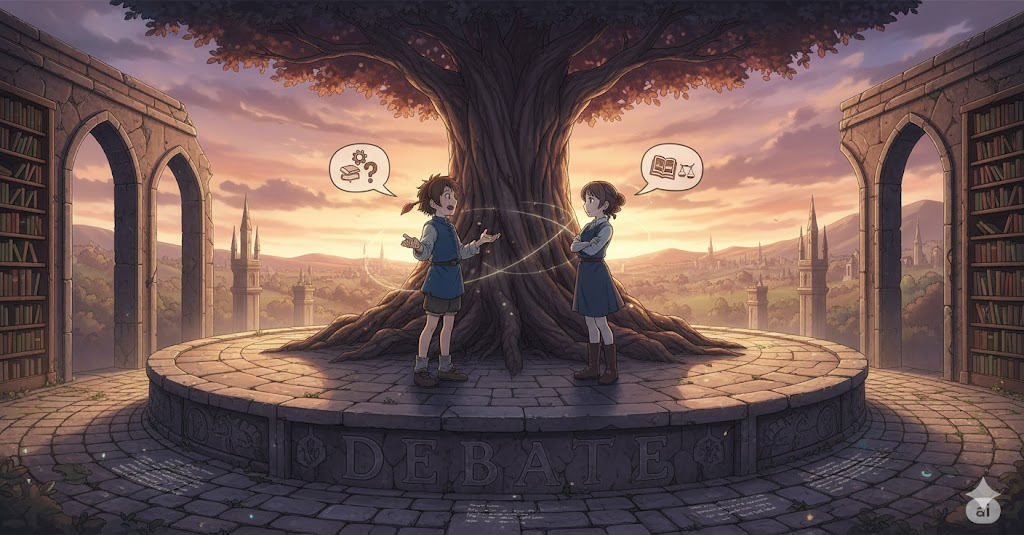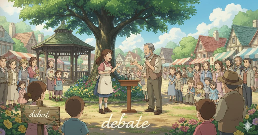 - (명사) 토론, 논쟁: 어떤 주제에 대해 찬반 의견을 교환하며 논증하는 과정.