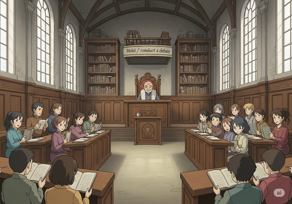 - (동사) 토론하다, 논쟁하다: 어떤 주제에 대해 논쟁하거나 의견을 교환하다.