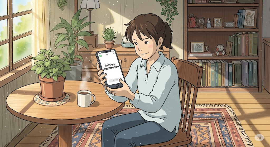 뉘앙스: 주문한 상품이 목적지에 성공적으로 배달되었음을 증명하는 행위나 알림을 의미합니다. 안심과 완료의 느낌을 담고 있습니다.