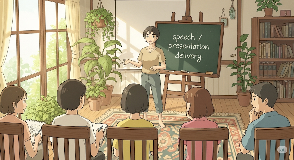 - 뜻: 연설/발표 전달(화법), 발표 방식