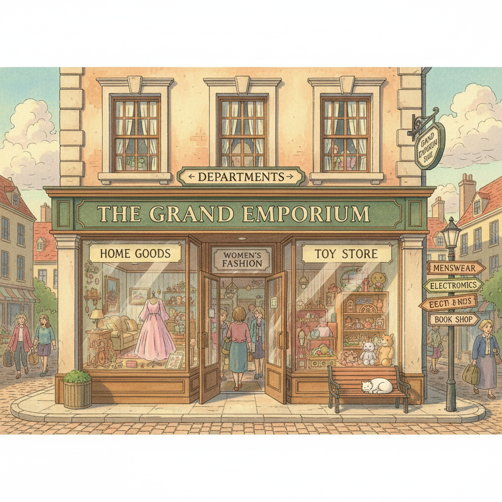 뉘앙스: 다양한 상품(옷, 화장품, 가전제품, 식료품 등)을 한 건물 안에서 판매하는 대규모 상점을 의미합니다. 쇼핑의 편리함과 다양한 선택지를 제공하며, 현대적인 소비 문화를 대표하는 느낌을 담고 있습니다.