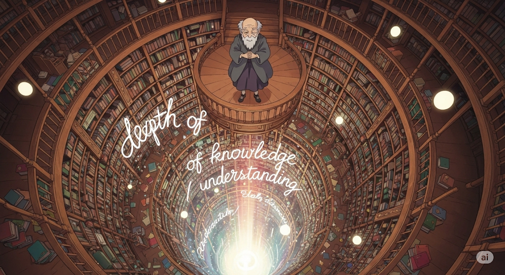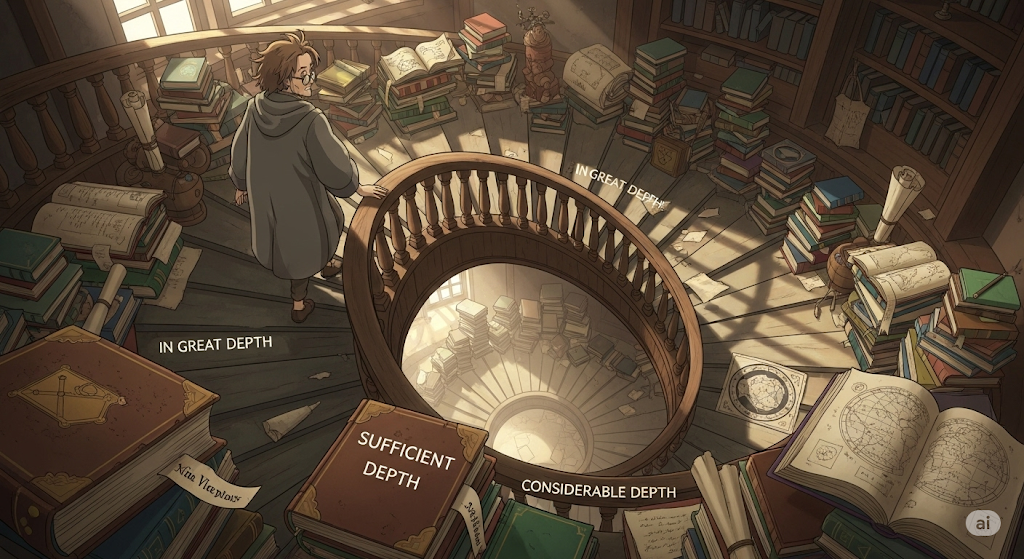 어떤 표면의 가장자리에서 아래쪽으로 또는 안쪽으로의 거리를 의미합니다. 물리적인 '깊이' 외에, 문제나 지식의 **'심오함'**이나 **'복잡성'**을 비유적으로 나타내는 데 사용됩니다. 겉으로 보이는 것 이상으로 깊이 파고드는 개념이 핵심입니다.