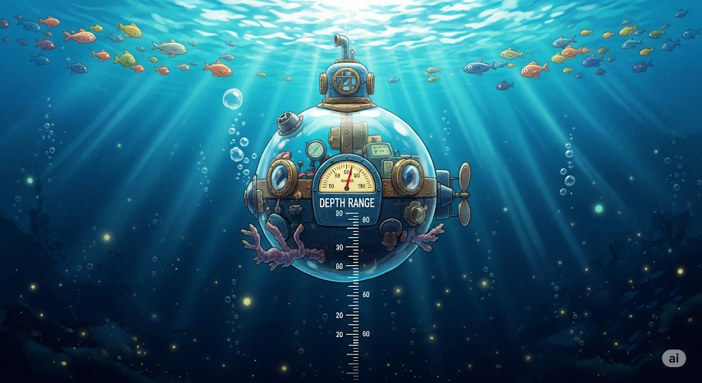 수심 범위, 깊이 범위. 어떤 장비나 기술이 작동할 수 있는 깊이의 한계.