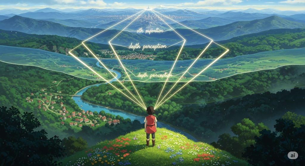 뉘앙스: 물체와의 거리를 인식하고 공간을 3차원으로 보는 능력을 의미합니다. 단순히 보이는 것 이상의 '깊이'를 이해하는 것을 강조합니다.