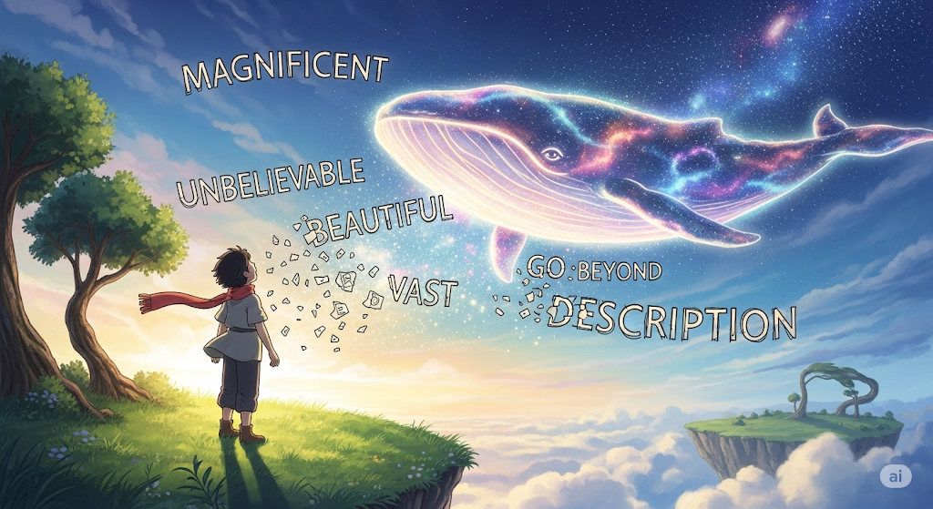어떤 사물, 경험(experience), 또는 상황이 '너무나', '압도적이거나', '놀라워서' '인간'의 '말'(words)이나 '묘사'(description) 능력으로는 '완전히 표현'(express)하거나 '정의'하기 어려운 상태를 의미합니다. 이는 '경이로움'(wonder)과 **'극찬'**에 초점이 맞춰져 있습니다.
