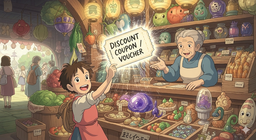 - *'discount coupon / voucher'**는 소비자가 특정 할인을 적용받기 위해 제시하는 물리적 또는 디지털 수단을 의미합니다.