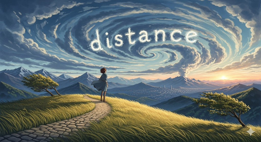 라틴어 distantia ("떨어져 있음")에서 유래 → distare ("떨어져 있다") → dis- ("떨어져") + stare ("서다") → 구 프랑스어 distance를 거쳐 영어로 유입 → 원래 **'서로 떨어져 있는 상태'**를 의미했음 → 이 의미가 현대 영어에서 '두 지점 사이의 물리적인 간격' (거리) 명사로 굳어졌어요. 나아가 **'사건 사이의 시간적 간격'**이나 '사람들 사이의 심리적/관계적 멀어짐' (간격, 차이)의 의미를 가지게 되었고, 동사로는 '물리적 또는 감정적으로 멀리 떨어뜨리거나 스스로 멀어지는 행위' (거리를 두다, 멀어지게 하다)의 의미를 가지게 되었어요. 즉, **'두 대상 간의 공간적, 시간적, 또는 심리적 분리 정도'**를 나타내는 핵심 단어예요.