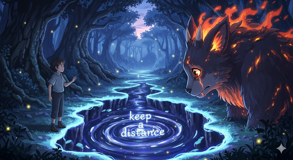 '특정' 사람(someone)이나 '상황'에 대해 **'물리적'**이거나 '감정적인' '간격'(distance)을 '유지'(keep)하는 행위를 의미합니다. 이는 'avoid **contact'**나 '관계 통제'(control)에 초점이 맞춰져 있습니다.
