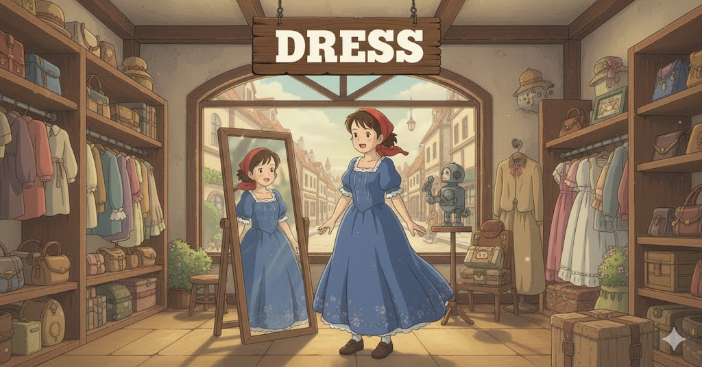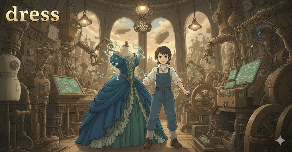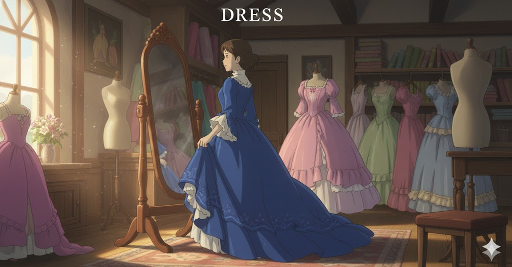 여성이나 소녀가 입는 상의와 치마가 하나로 이어진 옷(드레스)을 의미합니다. 명사로는 이처럼 특정한 종류의 옷을 뜻하지만, 동사로는 단순히 옷을 입는 일반적인 행위를 나타냅니다. 차려입는 행위와 특정한 의복이라는 개념을 모두 포함합니다.