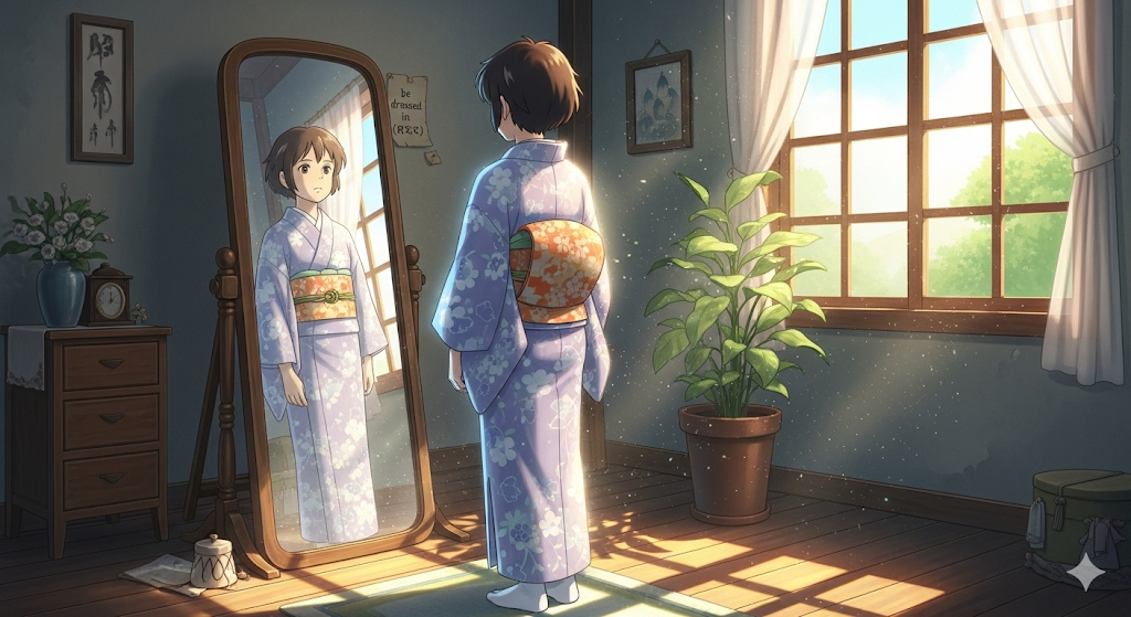 **'잠옷'**이나 '옷을 입지 않은' 상태에서, '외출'이나 '공적인 활동'을 위해 '옷을 입는 **행위'**를 의미합니다. 이는 '상태의 **전환'**과 '준비(preparation) **행위'**에 초점이 맞춰져 있습니다.