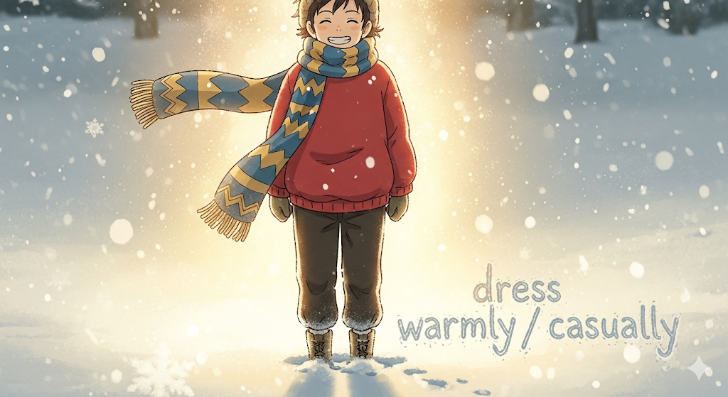- *'dress warmly / casually'**는 날씨나 상황에 맞게 옷을 입는 방법을 구체적으로 설명할 때 유용한 표현입니다.