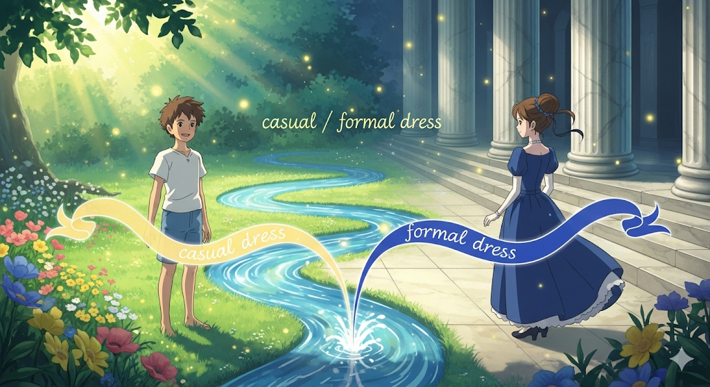 '일상적'이고 '편안한' 옷차림(casual)과, '격식'(formality)을 갖추고 '정중함'(decorum)을 요구하는 옷차림(formal)을 구분하는 용어입니다. 이는 '사회적', 또는 '직업적' 상황에 따른 '복장 규정'(dress code)을 나타냅니다.