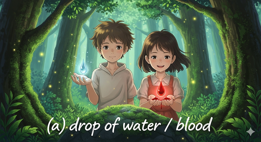 뉘앙스: 'a drop of water/blood'는 아주 작은 양의 물이나 피를 의미합니다. 이는 어떤 액체의 최소 단위를 나타냅니다. 비유적으로는 매우 적은 양의 무언가를 나타낼 때 사용될 수 있으며, 생명이나 존재의 근원을 상징하는 뉘앙스도 담고 있습니다. 이는 '한 방울'이 가진 희소성과 중요성을 강조하는 표현입니다.