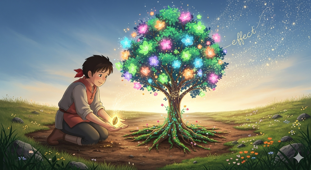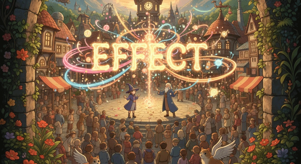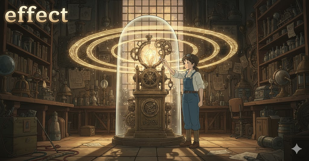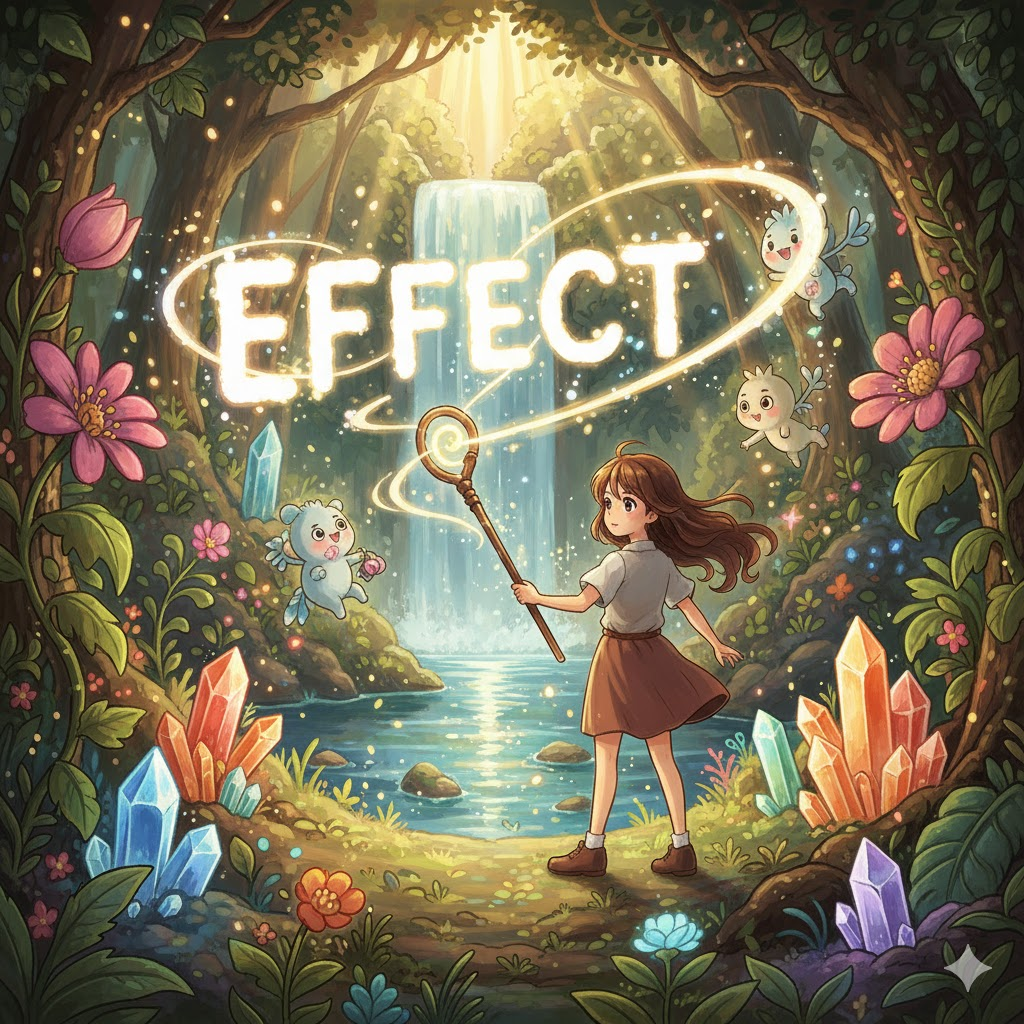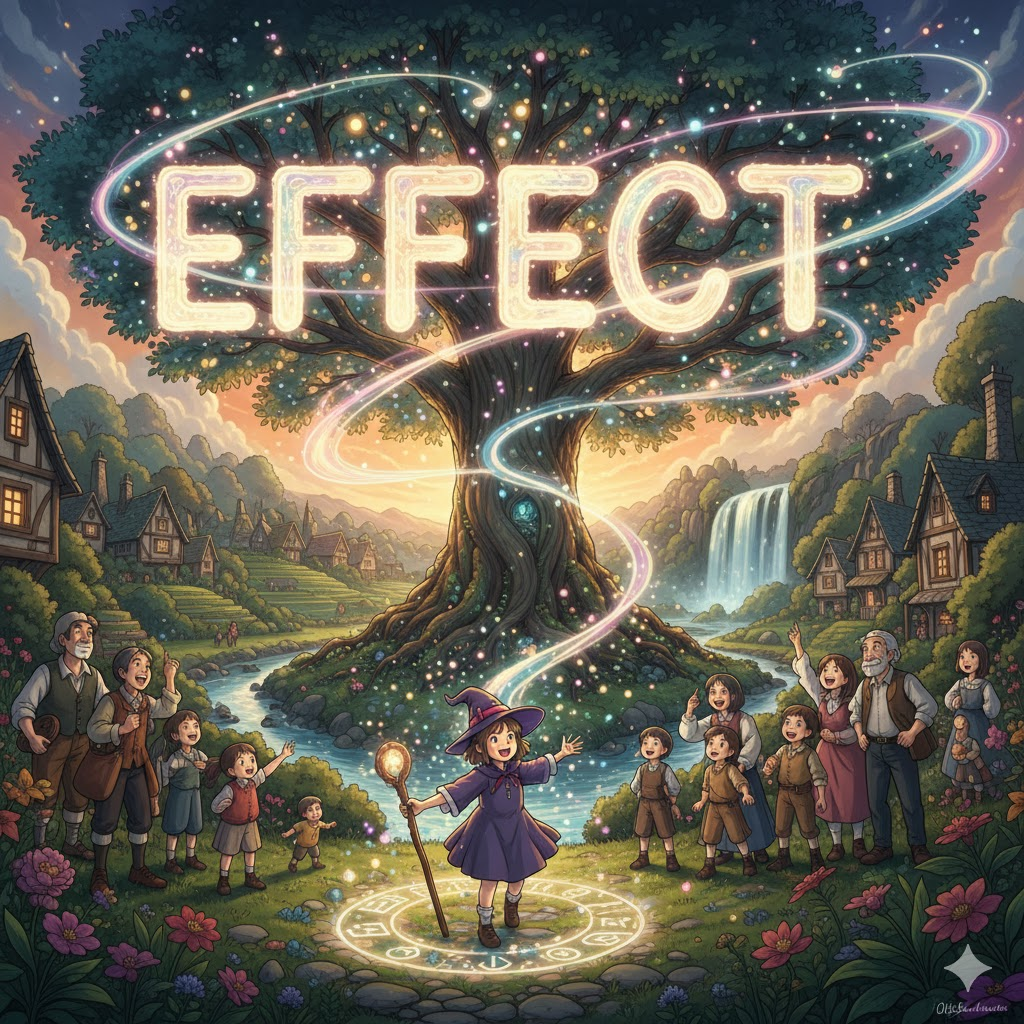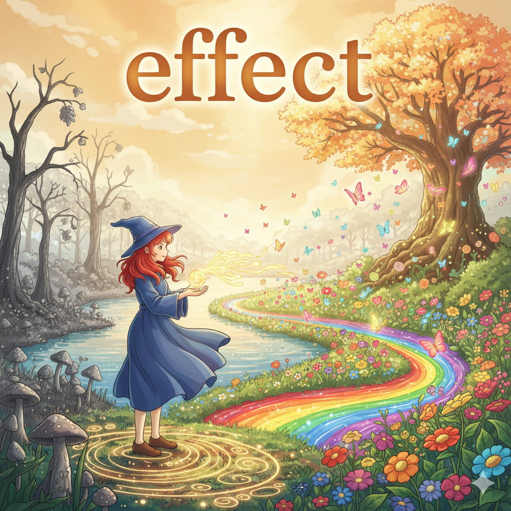 라틴어 effectus ("완성, 수행; 결과")에서 유래 → efficere ("완수하다, 성취하다, 만들어내다") → ex- ("밖으로") + facere ("만들다") → 즉, 원래 **'무언가를 만들거나 이뤄낸 결과'**를 의미했음 → 이 의미가 현대 영어에서 '어떤 작용으로 인해 나타나는 결과나 영향' (효과, 영향 / 결과) 명사로 굳어졌어요. 나아가 '개인의 소유물' (복수형으로)의 의미를 가지게 되었고, 동사로는 '원하는 결과를 만들거나 달성하는 행위' (초래하다, 달성하다)의 의미를 가지게 되었어요. 즉, **'원인에 따른 결과 또는 그 결과를 만들어내는 행위'**를 나타내는 핵심 단어예요.