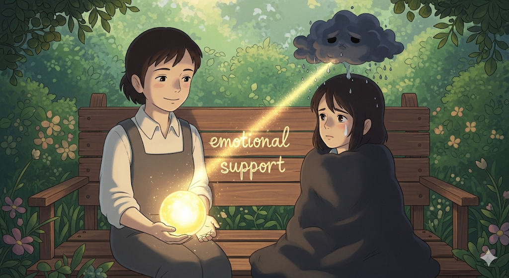 뉘앙스: 'emotional support'는 감정적으로 힘들어하는 사람에게 위로, 보살핌, 그리고 용기를 주는 것을 의미합니다. 이는 단순히 문제를 해결해주는 것이 아니라, 그 사람 곁에 있어주고, 이야기를 들어주며, 안전하고 이해받고 있다는 느낌을 주는 과정을 나타냅니다. 이는 공감과 깊은 인간적 연결을 강조하는 뉘앙스를 담고 있습니다.