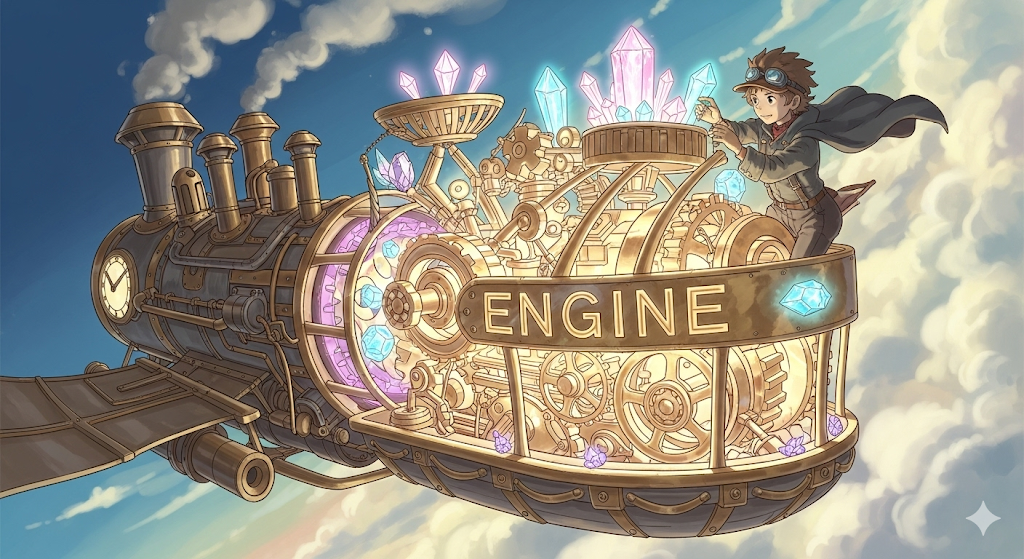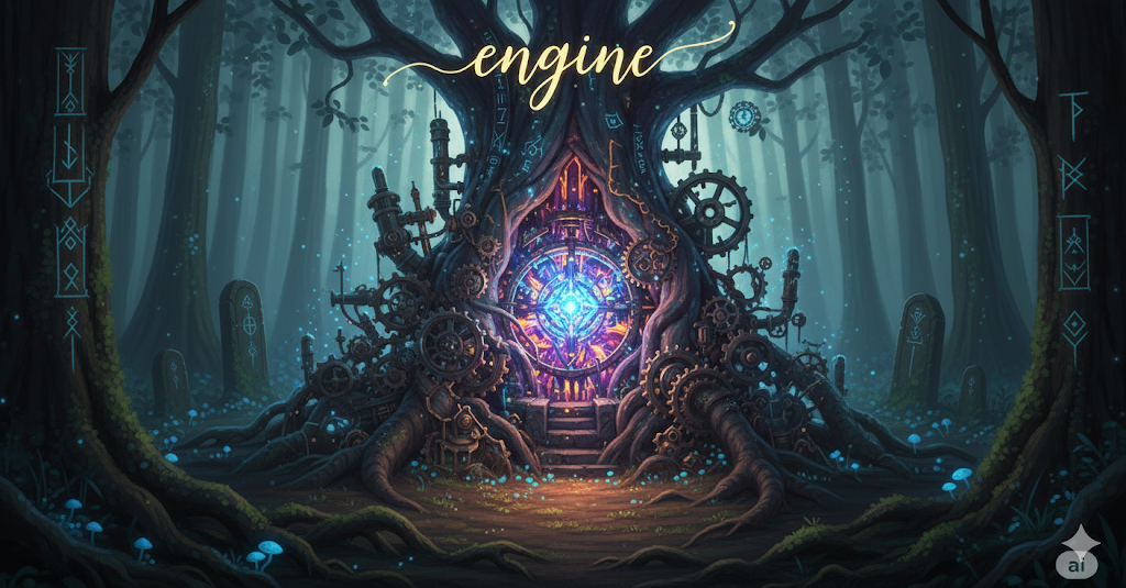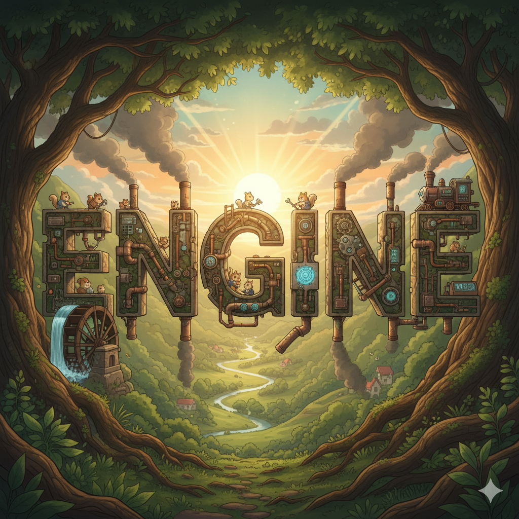 라틴어 ingenium ("타고난 능력, 재능; 발명품")에서 유래 → 구 프랑스어 engin ("재치, 기술, 기계")를 거쳐 영어로 유입 → 즉, 원래 **'영리한 발명품'**이나 **'기술적인 장치'**를 의미했음 → 이 의미가 18세기 산업 혁명과 함께 '기계적인 힘을 만들어내는 장치' (엔진, 기관) 명사로 굳어졌어요. 나아가 '어떤 일의 중심적인 동력이나 원인' (동력원, 원동력)의 의미를 가지게 되었어요. 즉, **'기계적인 동력을 만들거나 어떤 활동의 핵심적인 힘을 제공하는 장치나 요소'**를 나타내는 핵심 단어예요.