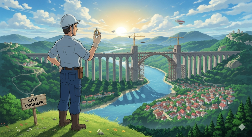 토목 기술자. 교량, 도로, 건물 등 사회 기반 시설을 설계하고 건설하는 전문가.