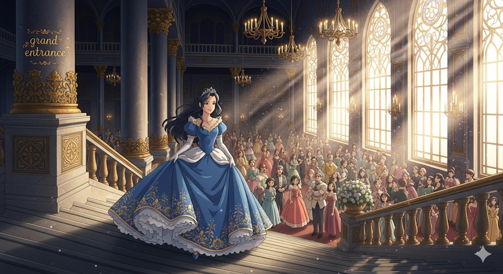 - 예문: She made a grand entrance at the party in a beautiful dress.
