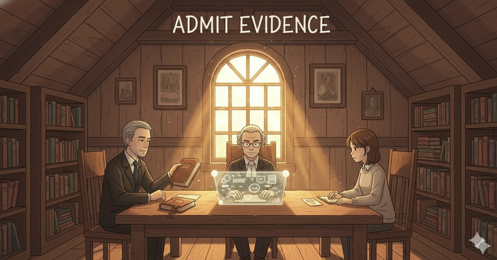 재판(court) 과정에서 '제시'된 증거(evidence)를 '법적 **절차'**와 '규칙'에 따라 '재판의 판단(judgment) 자료'로 사용하도록 '공식적으로 허가'(allow)하는 행위를 의미합니다. 이는 '증거의 법적 **유효성'**에 초점이 맞춰져 있습니다.