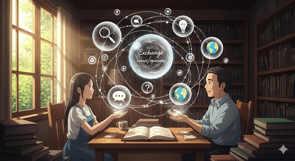 견해/의견을 교환하다. 특정 주제에 대한 자신의 생각과 다른 사람의 생각을 공유하는 것.