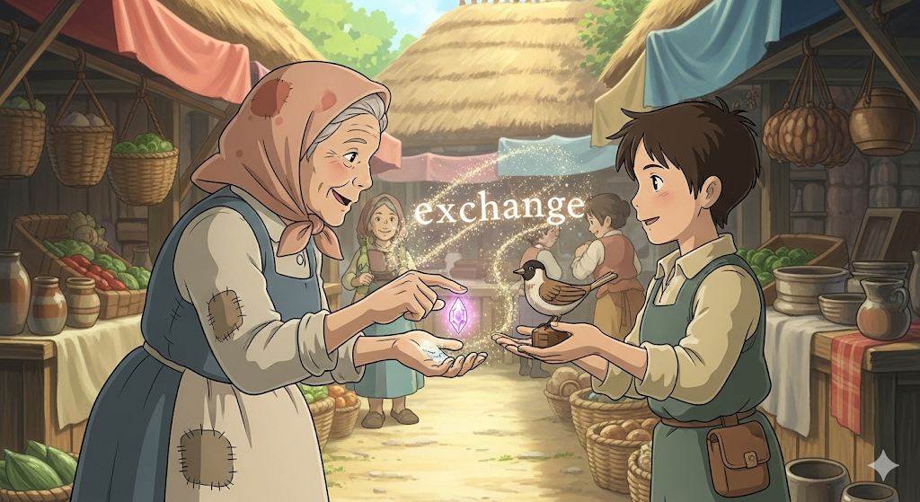 어떤 것을 대가(cost)로 다른 것을 주고받는 행위를 의미합니다. 물물교환처럼 물건을 맞바꾸는 것부터, 돈을 다른 통화로 바꾸는 환전, 또는 의견이나 정보(information)를 교류하는 것까지 포괄합니다. 핵심은 상호 간의 주고받음입니다.