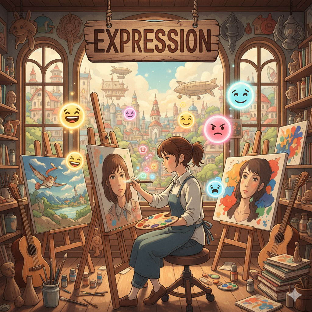생각, 감정(emotion), 또는 아이디어(idea)를 말, 글, 예술 등 다양한 형태를 통해 밖으로 드러내는 행위나 그렇게 드러난 결과물을 의미합니다. 얼굴의 표정처럼 감정을 비추는 외적 모습뿐만 아니라, 의미를 전달하는 방식 그 자체를 뜻하기도 합니다.