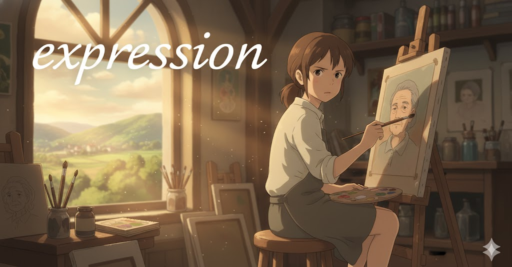 라틴어 expressio ("짜내기, 묘사, 표현")에서 유래 → exprimere ("짜내다, 압력을 가하다, 묘사하다") 동사에서 파생 → 즉, 원래 **'무언가를 밖으로 짜내어 나타내는 것'**을 의미했음 → 이 의미가 현대 영어에서 '내면의 생각이나 감정을 외부로 드러내는 행위' (표현, 표시) 명사로 굳어졌어요. 나아가 '얼굴에 나타나는 감정의 흔적' (표정)과 '표현하는 능력이나 방식' (표현력)의 의미를 가지게 되었고, 수학이나 언어에서 '간결하게 나타낸 형태' (식, 공식, 단어, 문구)로 확장되었어요. 즉, **'내면의 것을 밖으로 드러내거나 나타내는 다양한 방법'**을 나타내는 핵심 단어예요.