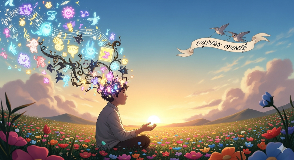 뉘앙스: 검열이나 제한 없이 자신의 생각, 의견, 감정 등을 자유롭게 드러낼 수 있는 것을 의미합니다. 창의성과 개성을 발휘하여 자기 자신을 온전히 나타내는 것을 강조합니다.