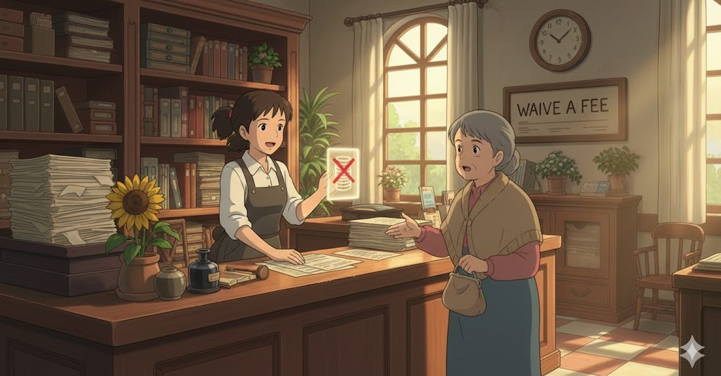 뉘앙스: 납부해야 할 수수료나 요금을 받지 않고 면제해 주는 것을 의미합니다. 상대방에게 편의를 봐주거나 배려하는 상황에서 사용됩니다.