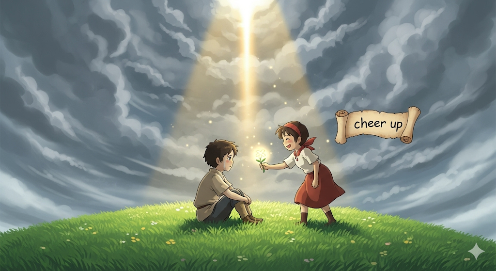 - (그녀는 슬펐지만, 농담 하나에 기분이 좋아졌다.)