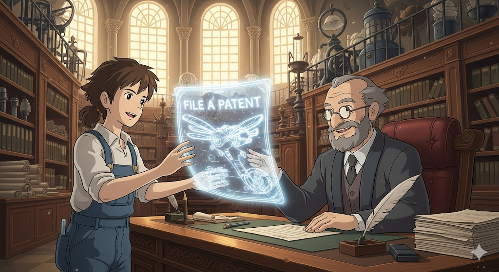 새로운 발명품(invention)이나 기술(technology)에 대한 '법적 보호(legal protection) 권리'를 얻기 위해 특허청(patent office)에 공식적으로 문서(document)를 제출(file)하는 행위를 의미합니다. '지적 재산권 확보의 첫 **단계'**에 초점이 맞춰져 있습니다.