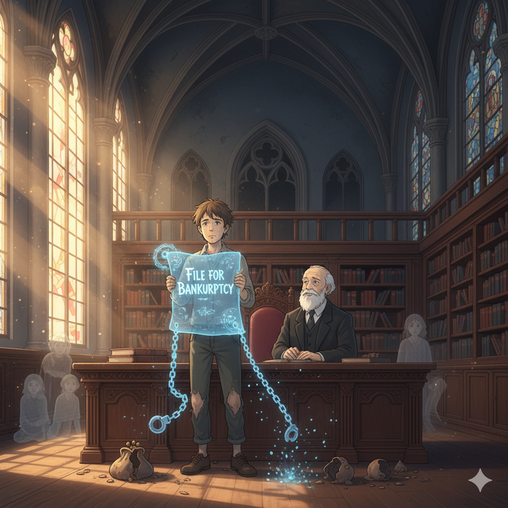 뉘앙스: 기업이나 개인이 재정적으로 더 이상 빚을 갚을 능력이 없을 때, 법원에 공식적으로 파산을 선언하는 것을 의미합니다. 재정적인 어려움과 함께, 법적인 절차를 통해 새로운 시작을 준비하는 행위를 나타냅니다.