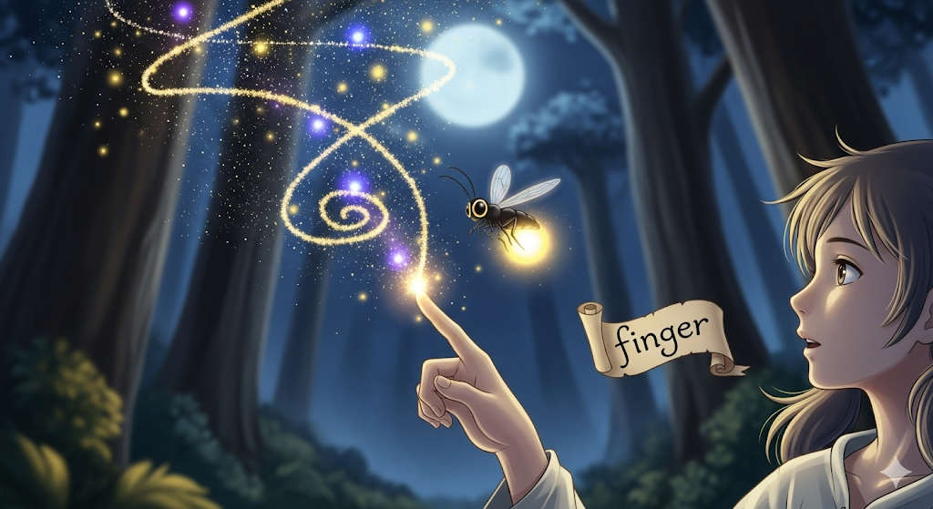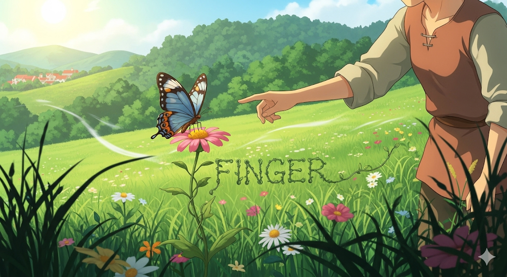 고대 영어 finger ("손가락")에서 유래 → 게르만어 공통 조상에서부터 내려온 단어 → 즉, 원래 **'손의 끝 부분에 있는 지각 기관'**을 의미했음 → 이 의미가 현대 영어에서 '손바닥 끝에 달린 신체 부위' (손가락) 명사로 굳어졌어요. 나아가 이러한 손가락의 기능과 관련하여 '손가락으로 촉각을 느끼거나 방향을 지시하는 행위' (만지다, 가리키다) 동사로 확장되었고, 비유적으로 '누군가의 잘못을 지적하여 알리는 행위' (고발하다, 밀고하다)의 의미로도 사용됩니다. 즉, **'손가락이라는 신체 부위와 그 기능 및 비유적인 행위'**를 나타내는 핵심 단어예요.